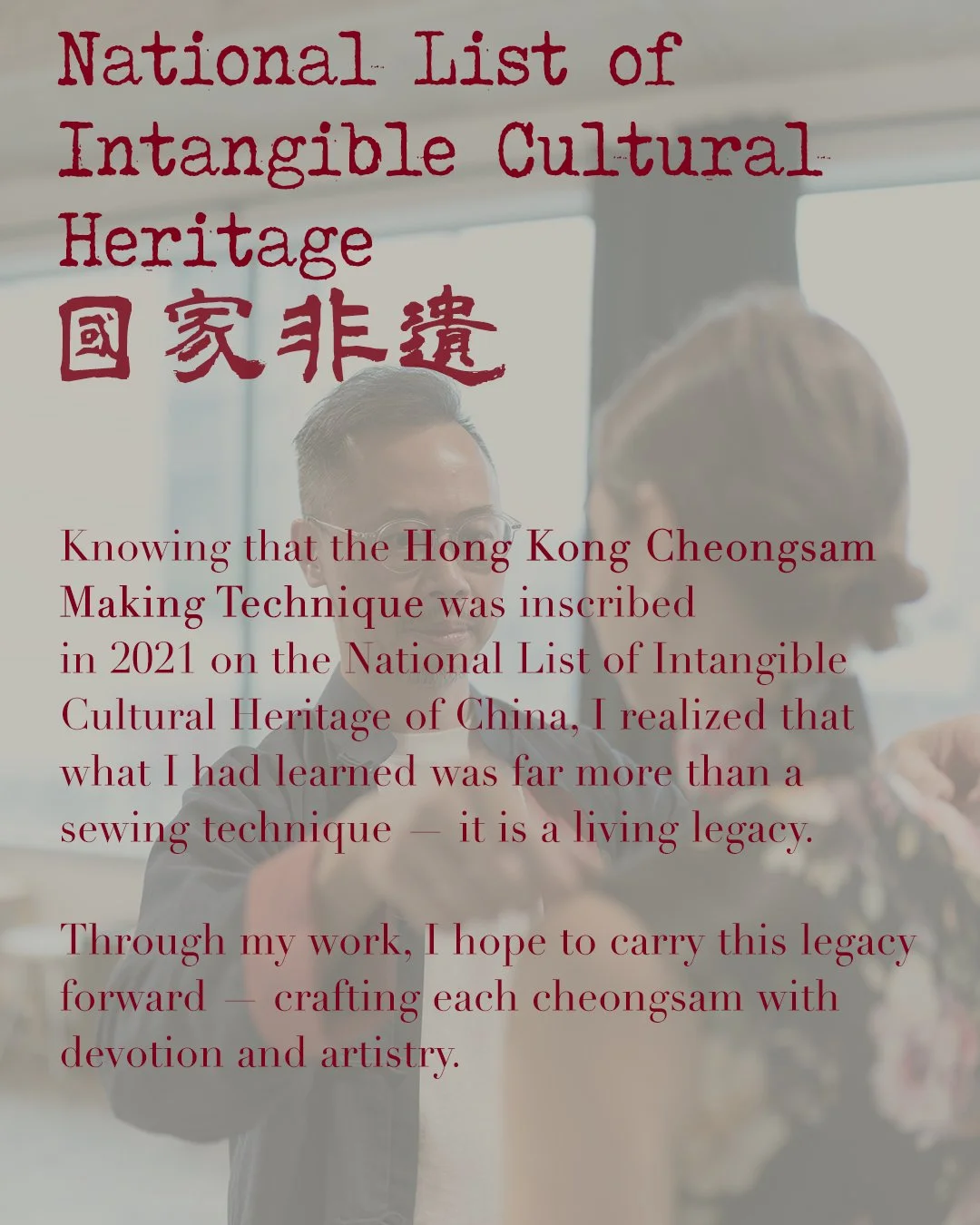 當我得知「香港中式長衫製作技藝」於2021年被列入中國「 國家級非物質文化遺產名錄」 時,我意識到自己所學的不僅僅是一門縫製技藝,而是一份有生命的傳承。 透過我的作品,我希望將這份傳承延續下去,以匠心製作每一件旗袍。